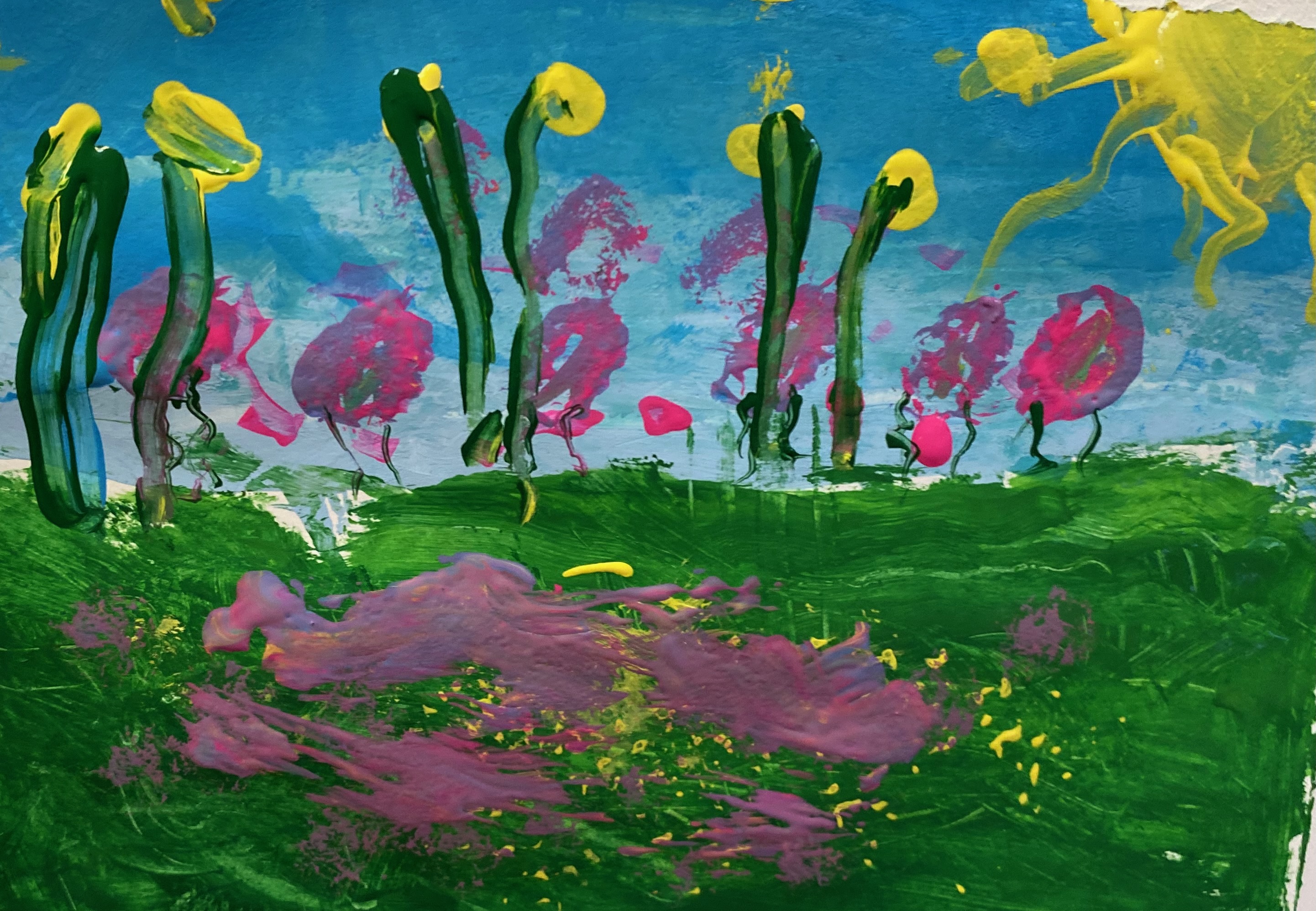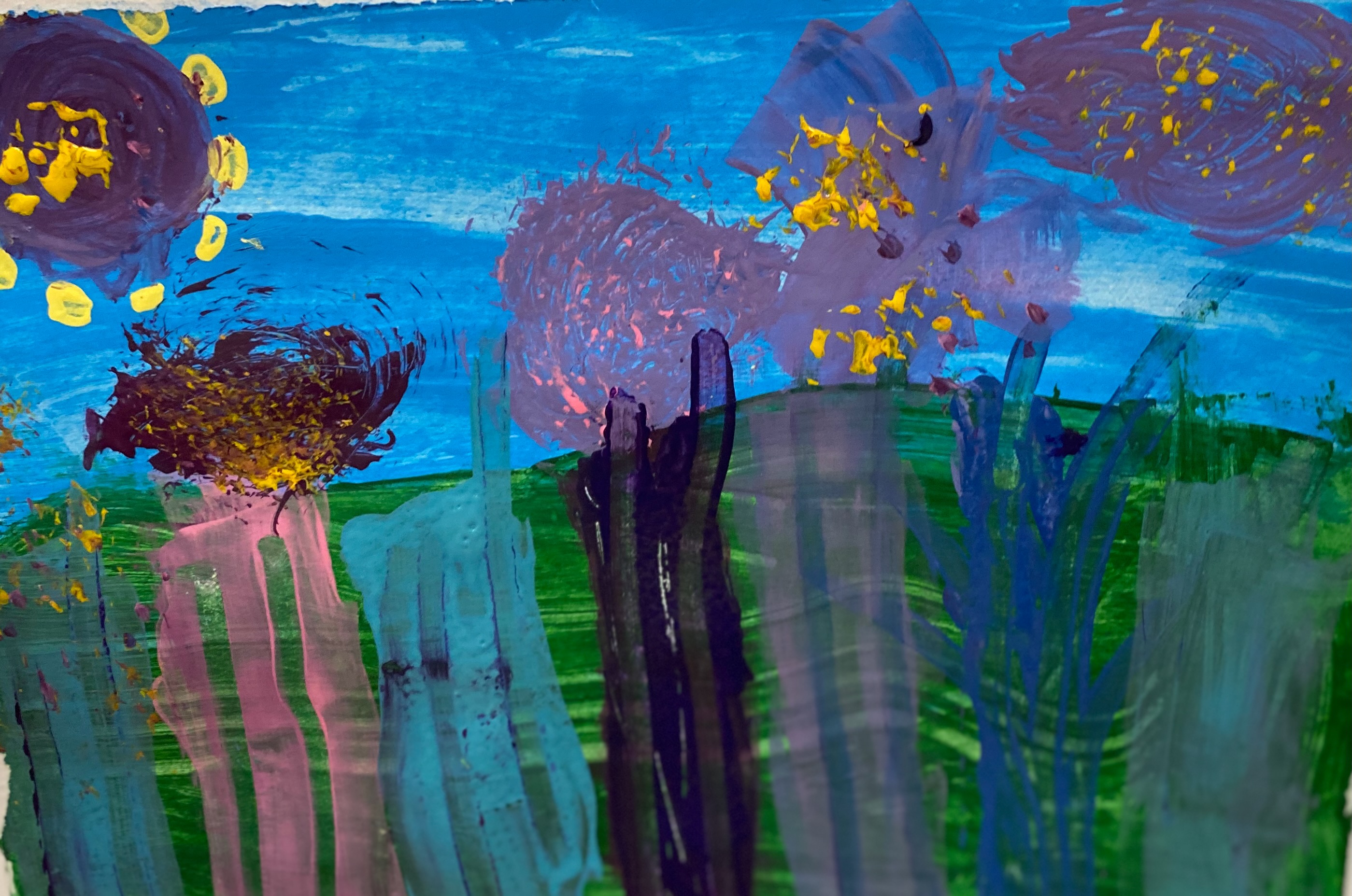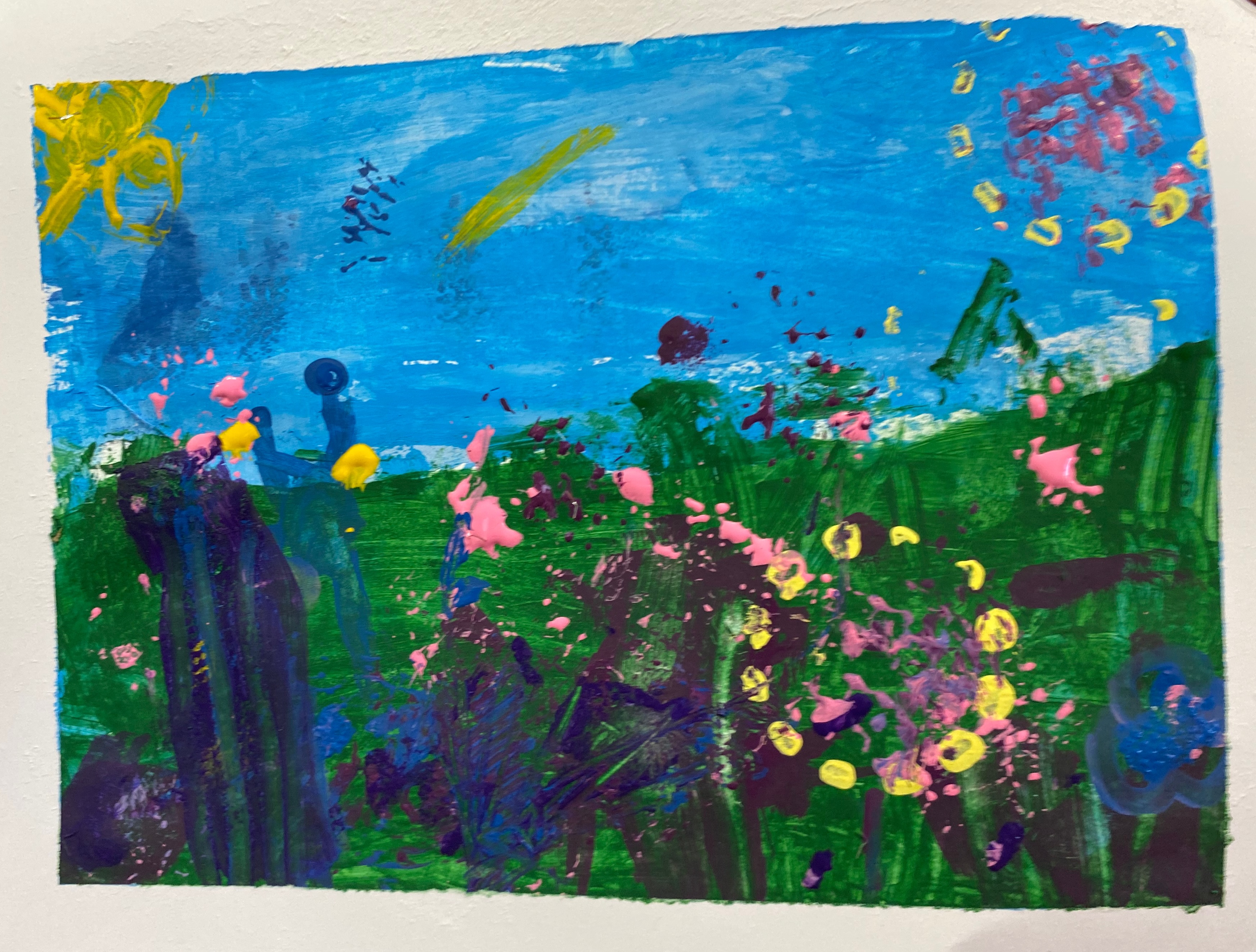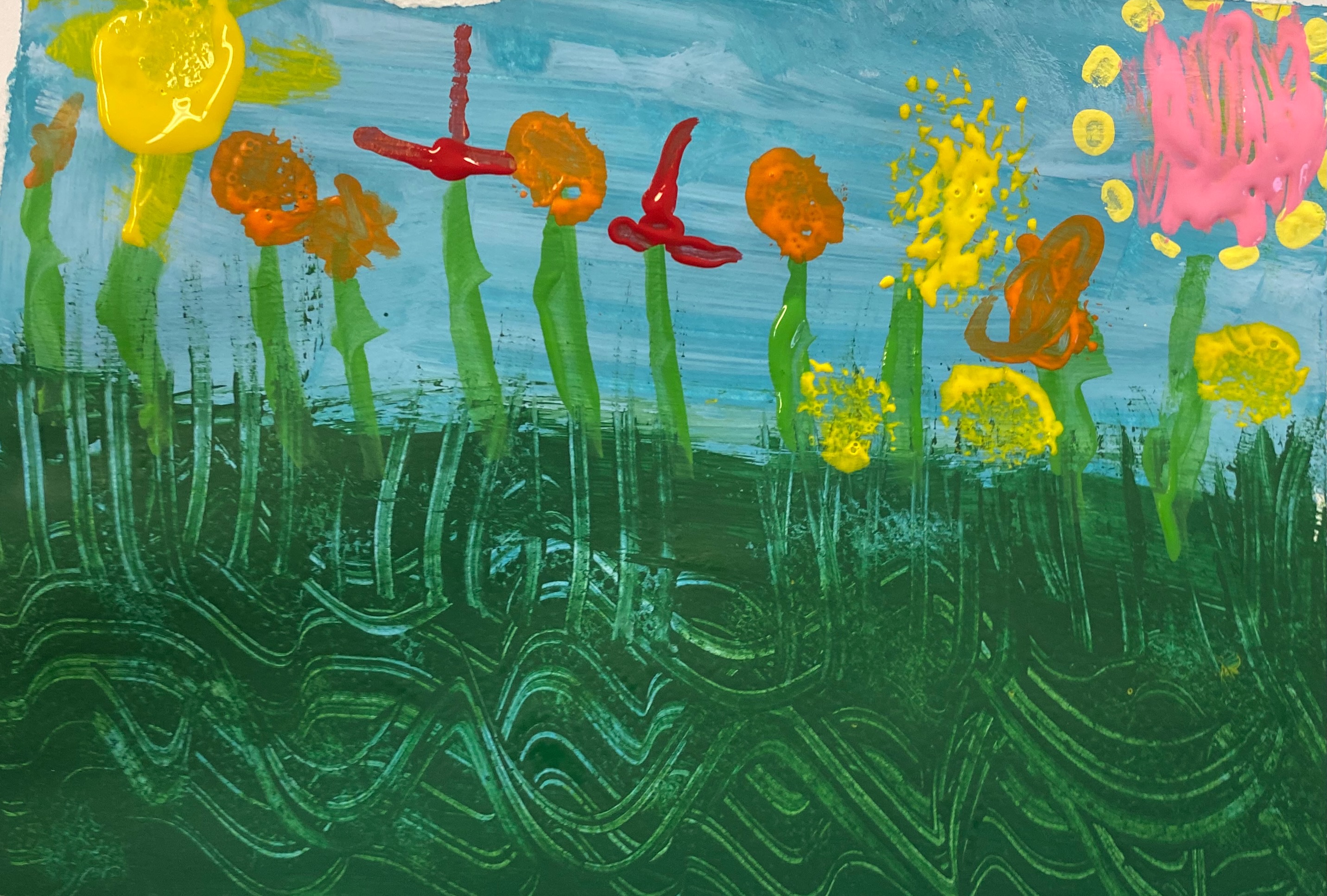 Our 4 & 5 year old artists painted a Spring Meadow last week – without paintbrushes!