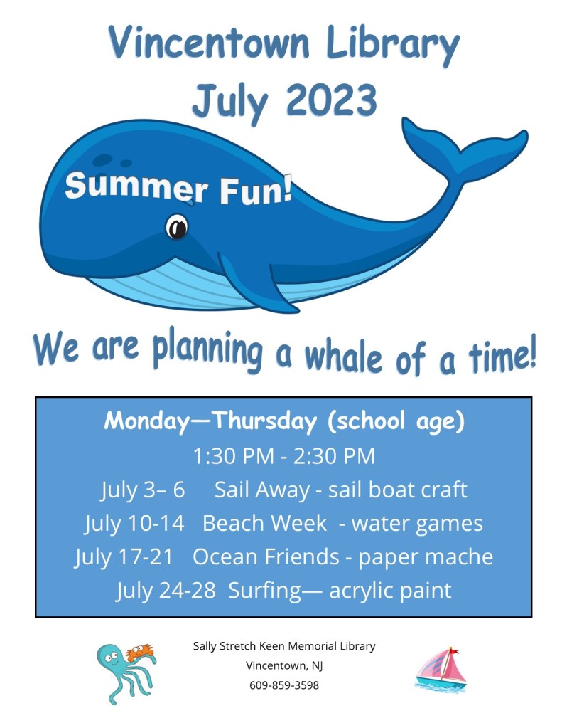 Moving into July, in addition to the regular Wednesday Story Hour, Miss Kim has tons of fun planned for kids. Art and craft projects and outdoor activities are already on the schedule.