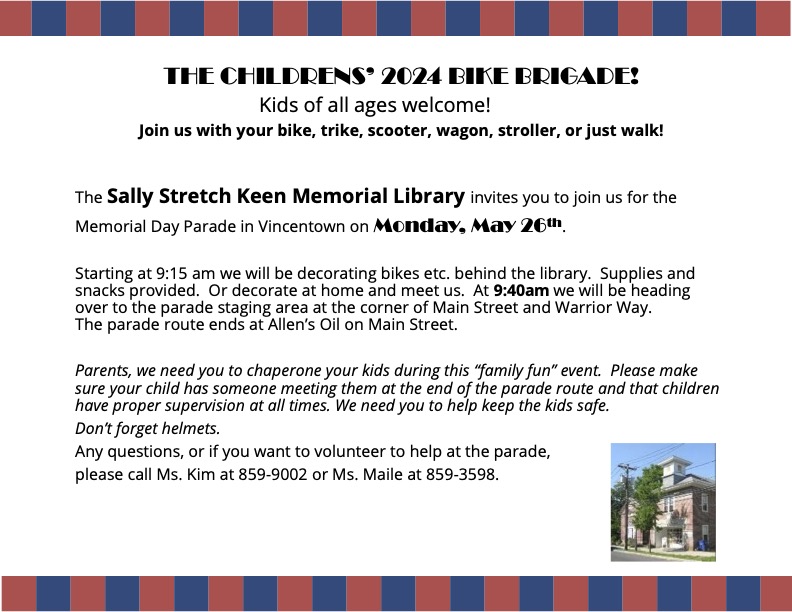 Our library will again be participating in the parade with the Children’s Bike Brigade. And again, lemonade will be offered outside the Children’s Library for the thirsty crowd.